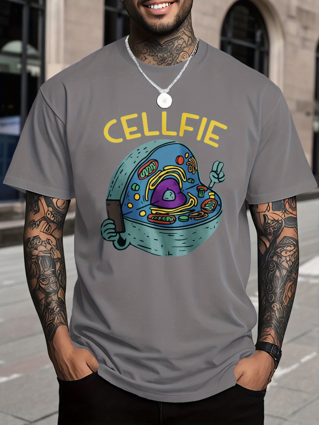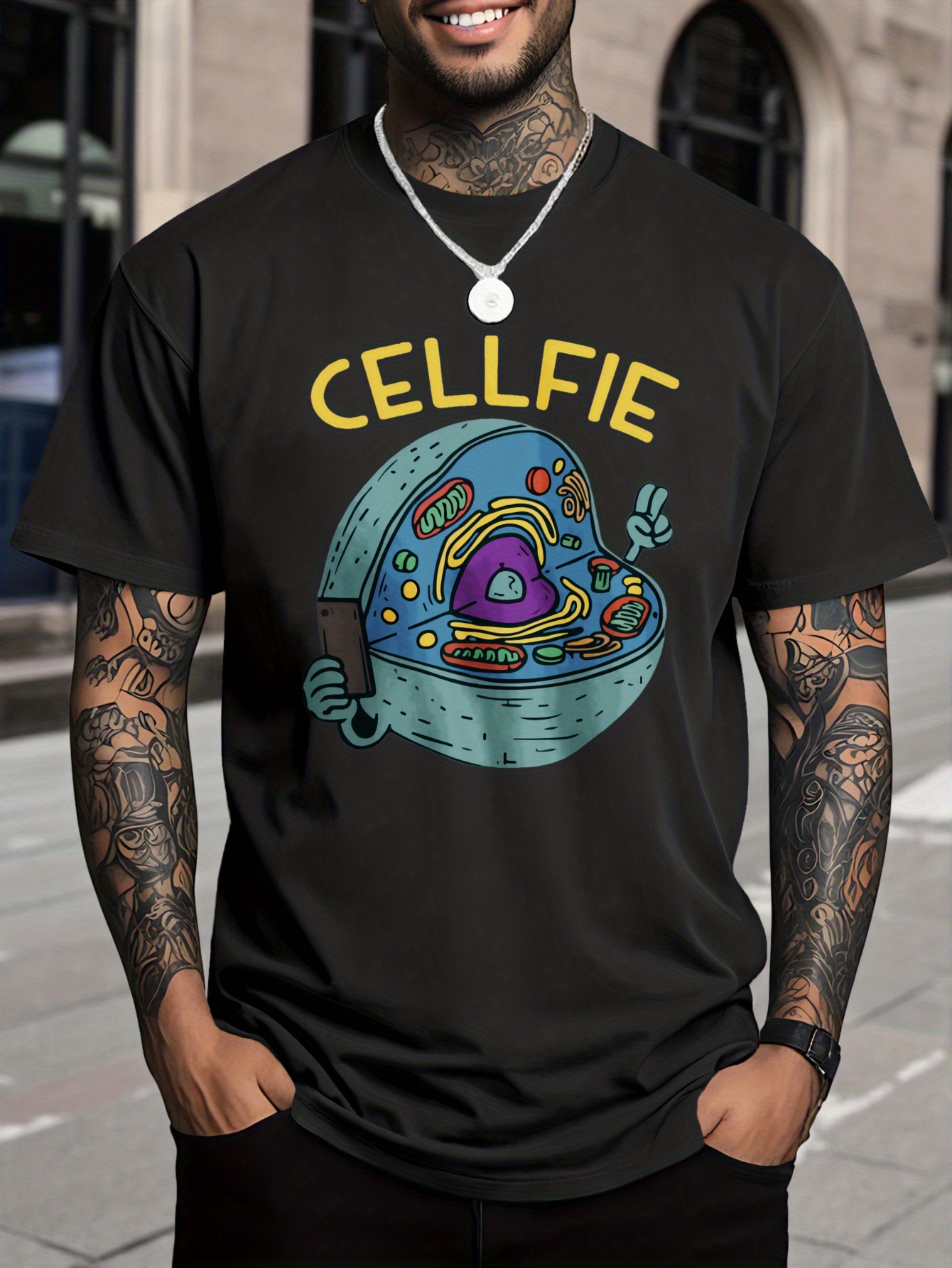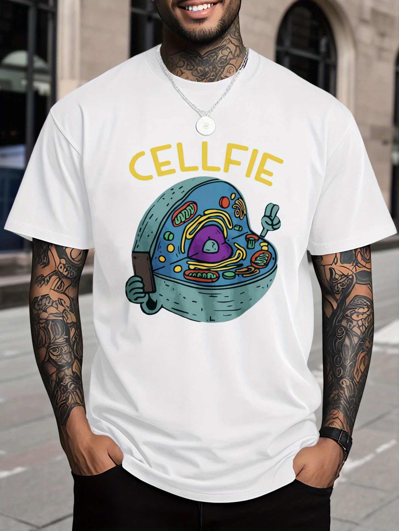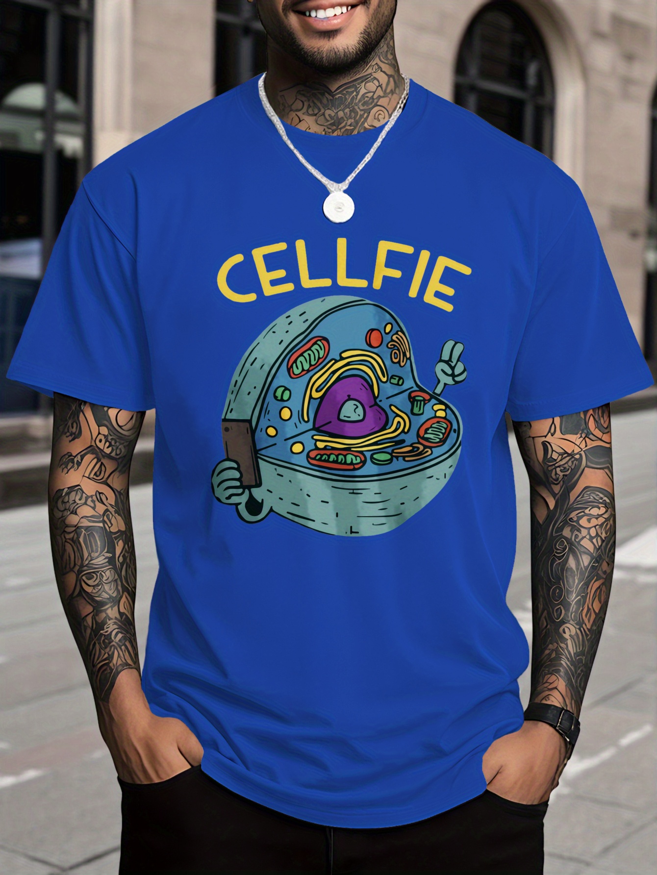 Men's 100% Cotton T-Shirt with Cellfie Cell Science Art Print - Slim Fit & Casual Round Neck Tee, Breathable Fabric with Science-Themed Cell Design for Tech Events, Biology Parties & Casual Attire