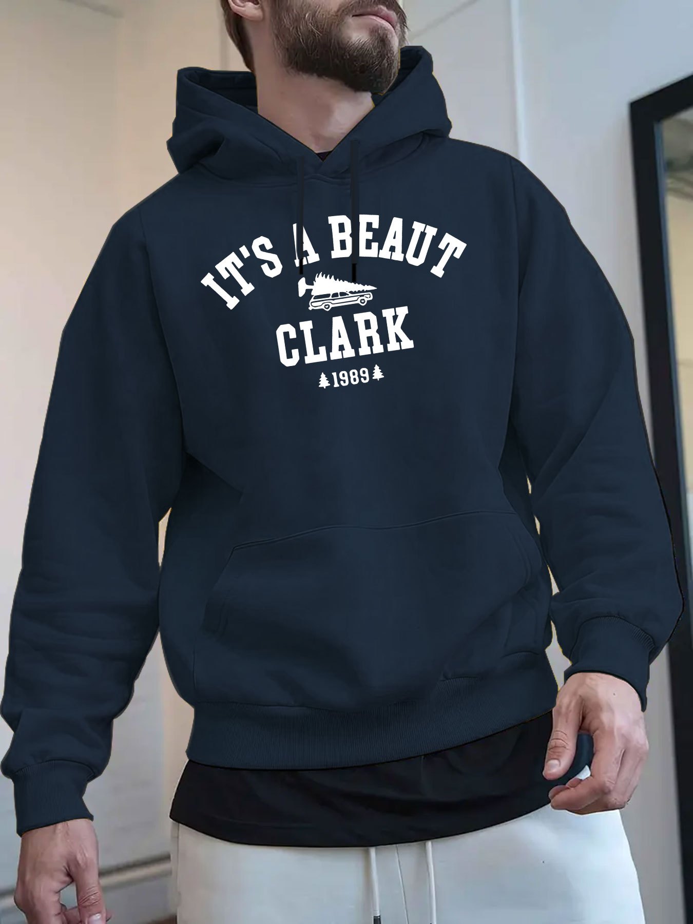 Men's Black Christmas Hooded Sweatshirt with Clark "Beaut Clark" Movie Quote Print, Long Sleeve Pullover Hoodie, Front Pocket & Machine Washable - Casual Winter Wear for National Lampoon's Christmas Party Outfit
