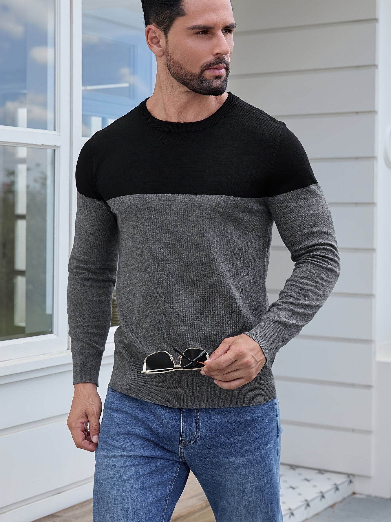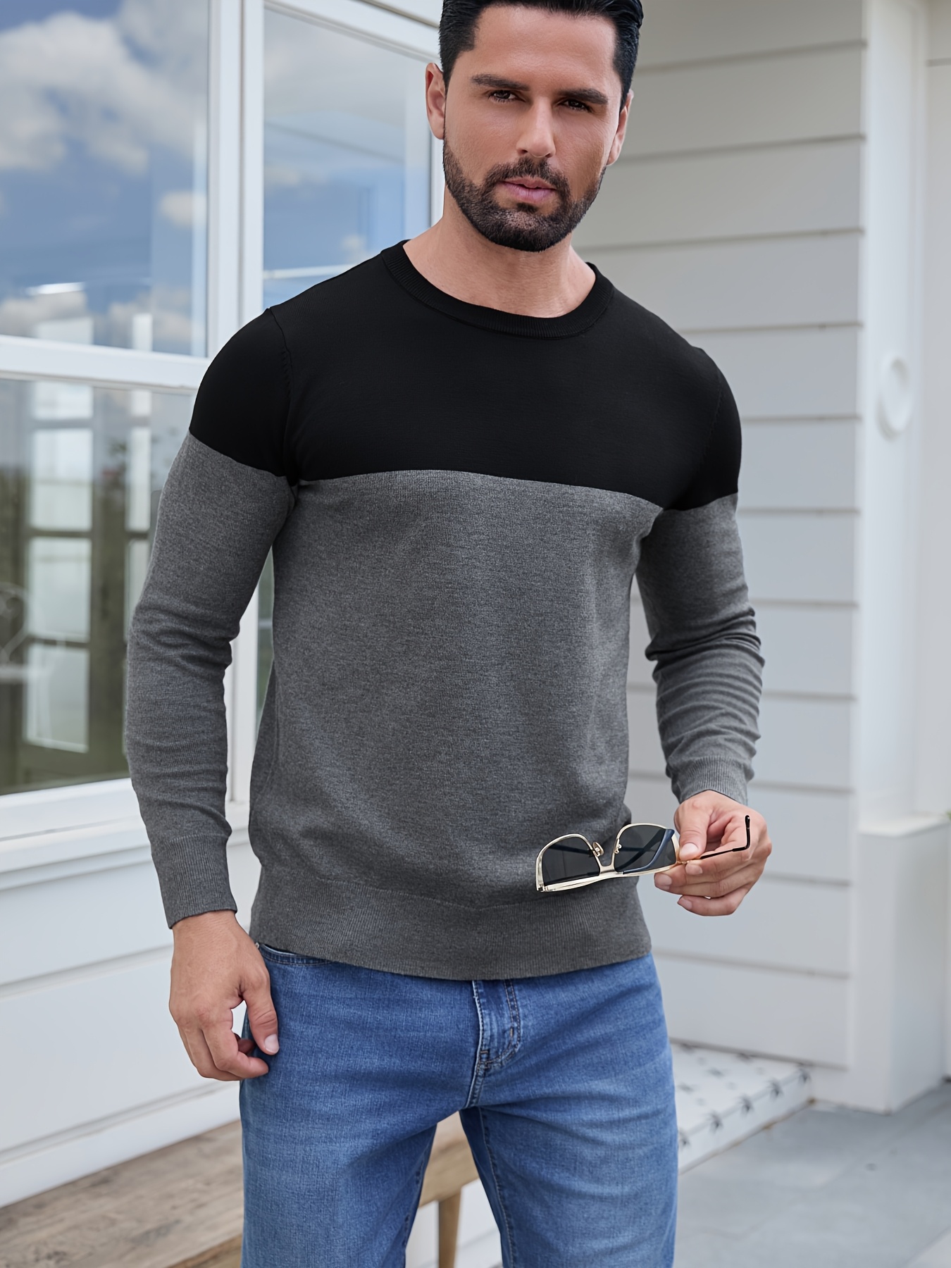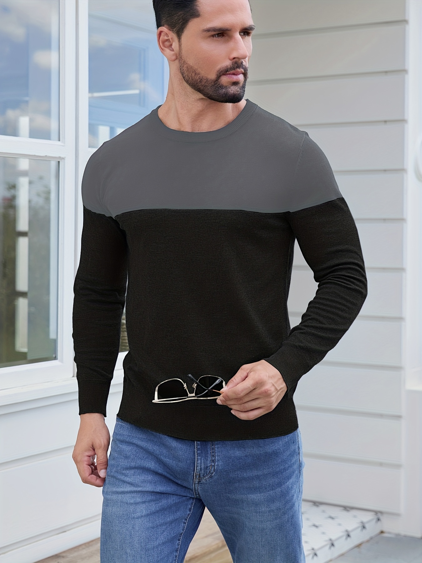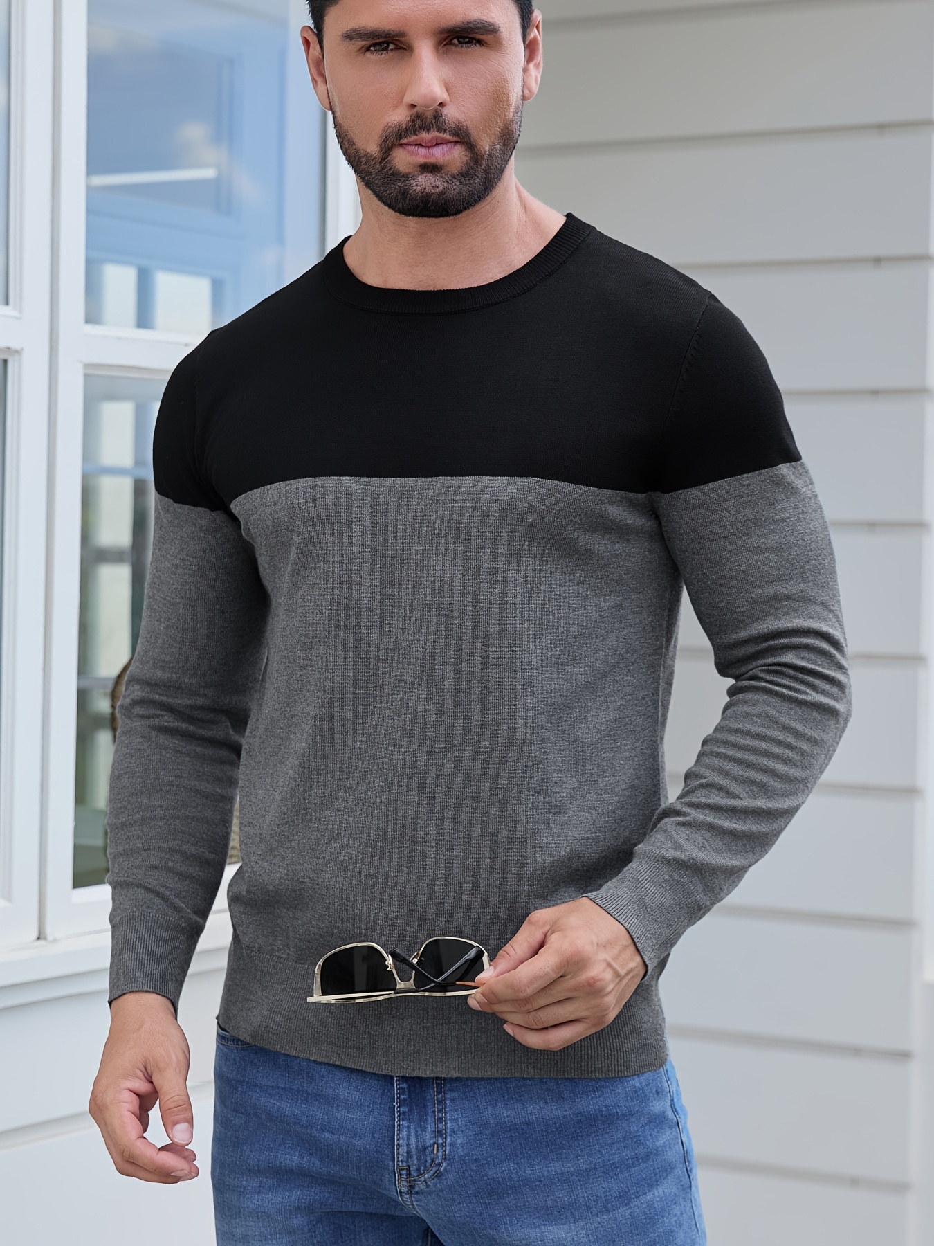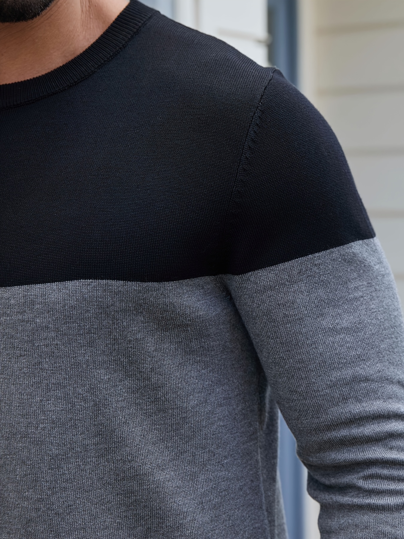 Men'S Casual Long Sleeve Crew Neck Sweater - & Grey Color Block Design, Soft Stretchy Fabric, Regular Fit, Spring/Fall Essential for Casual Attire, Knit, Spring Fall Clothing, Classic Knitwear, Comfortable Knitwear