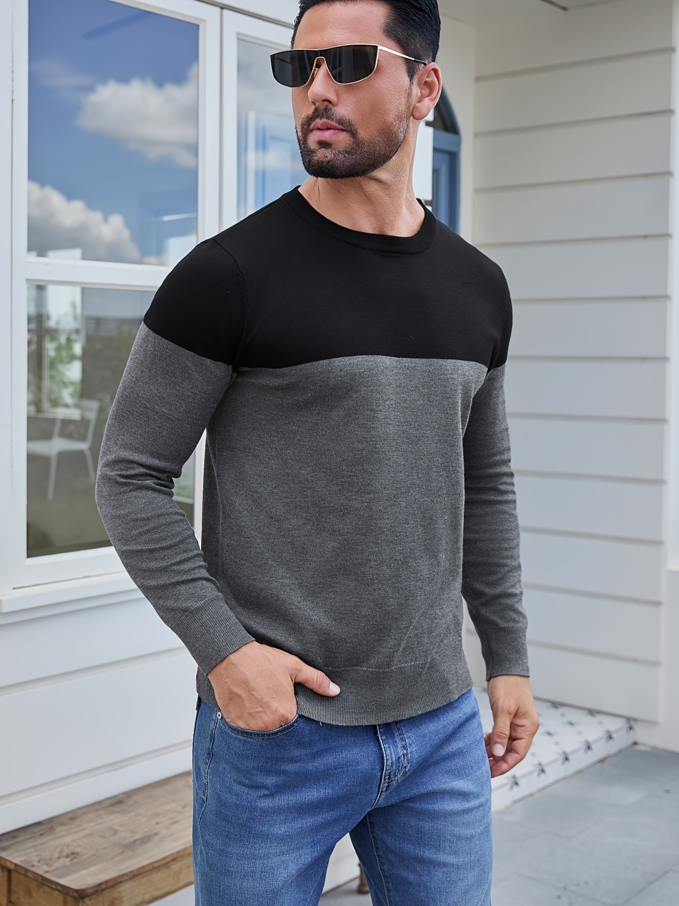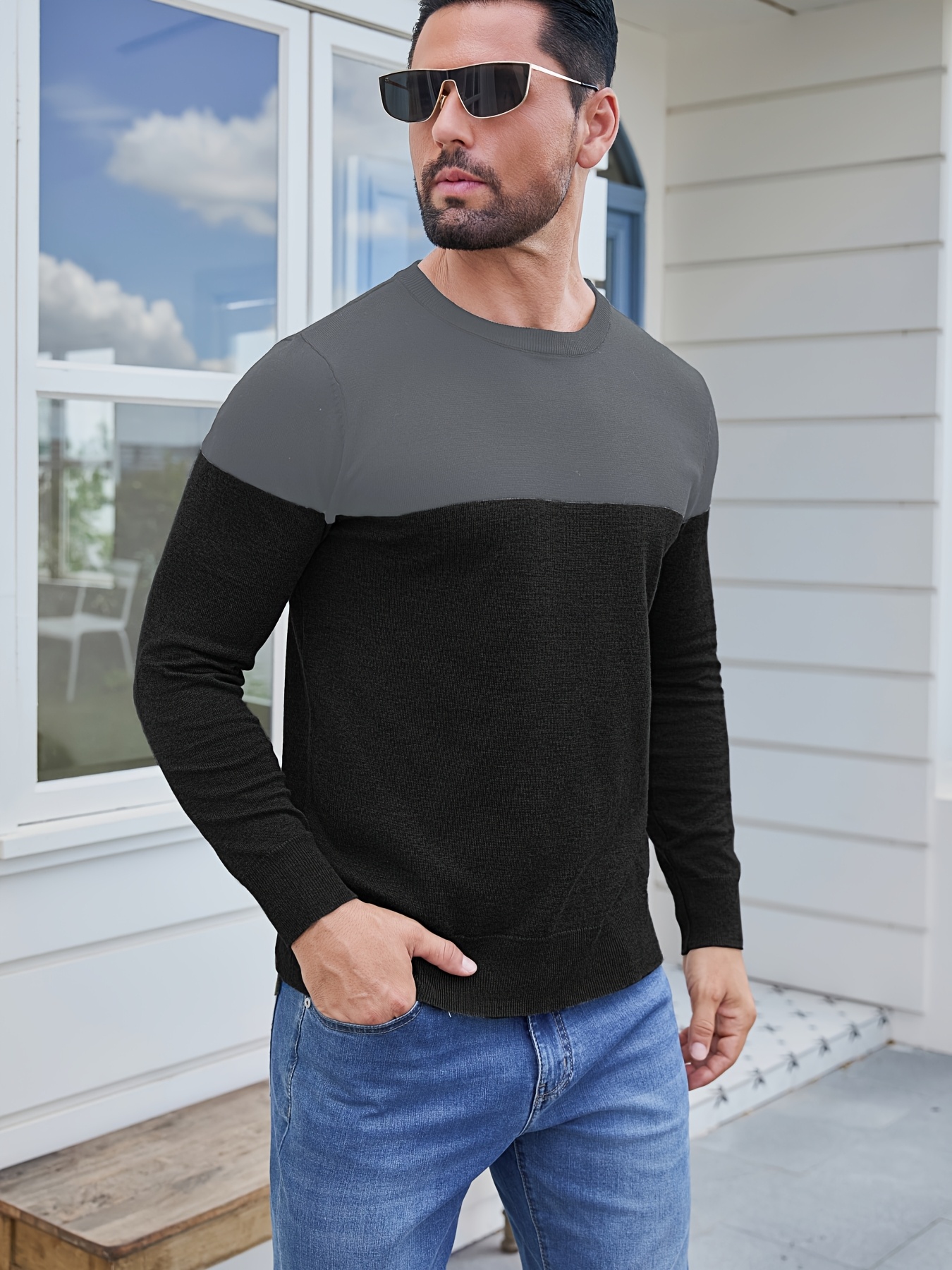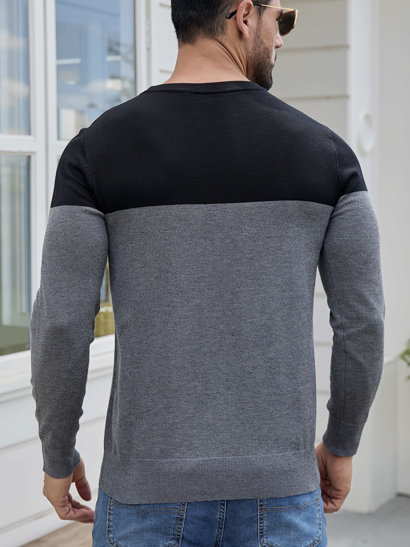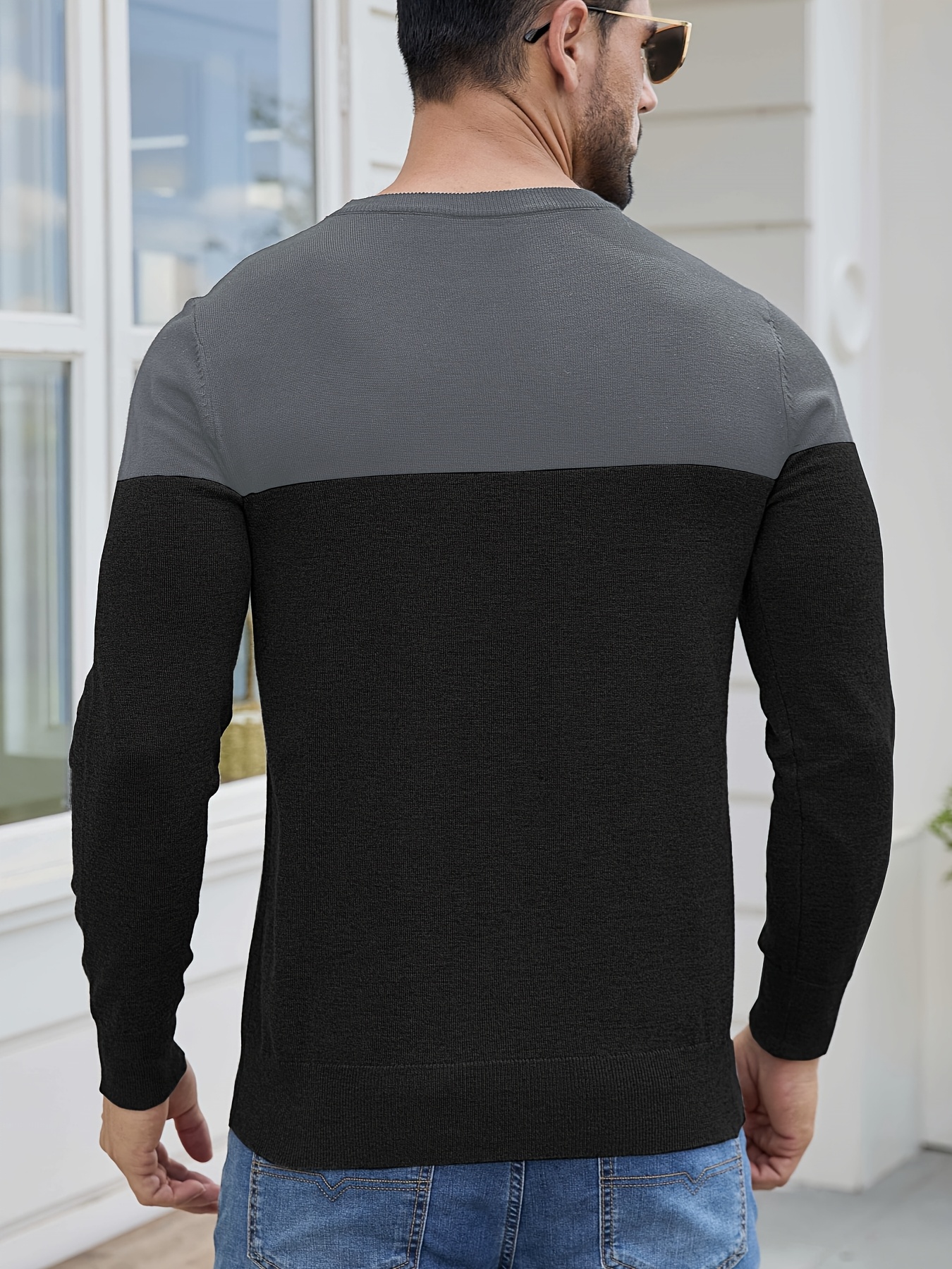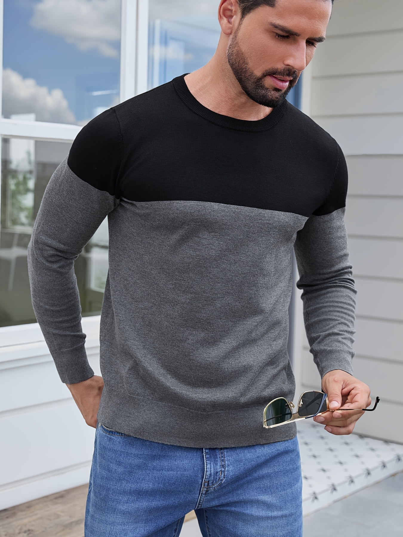 Men'S Casual Long Sleeve Crew Neck Sweater - & Grey Color Block Design, Soft Stretchy Fabric, Regular Fit, Spring/Fall Essential for Casual Attire, Knit, Spring Fall Clothing, Classic Knitwear, Comfortable Knitwear
