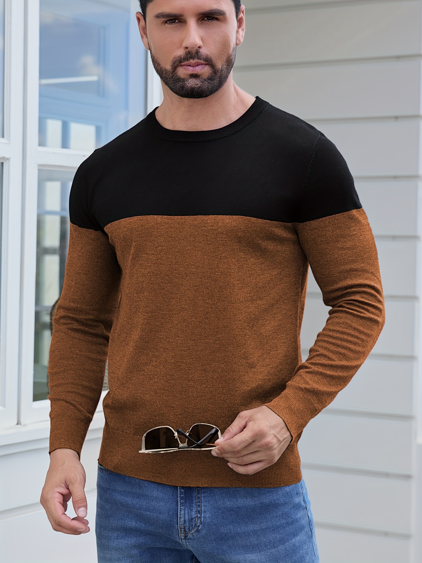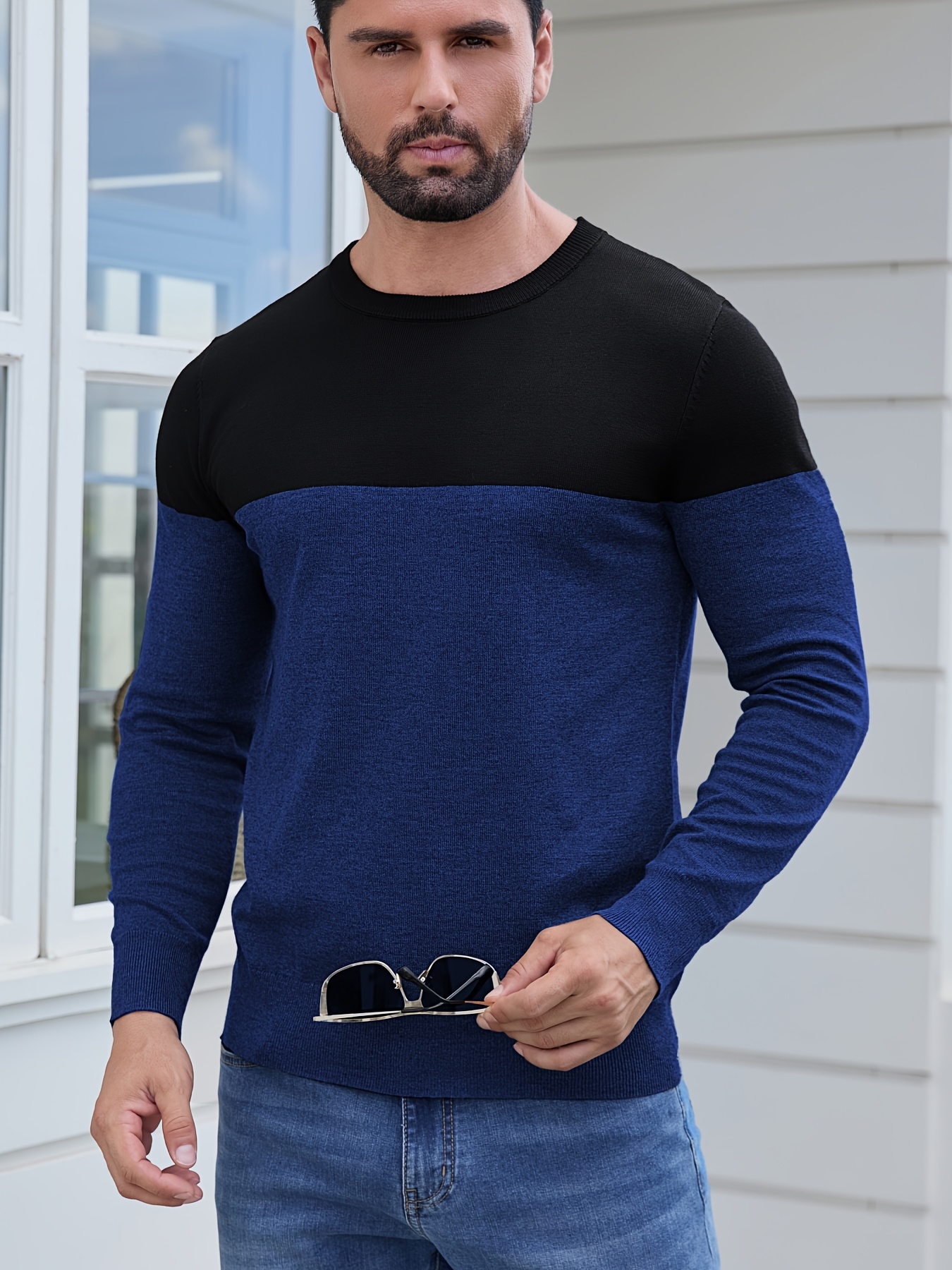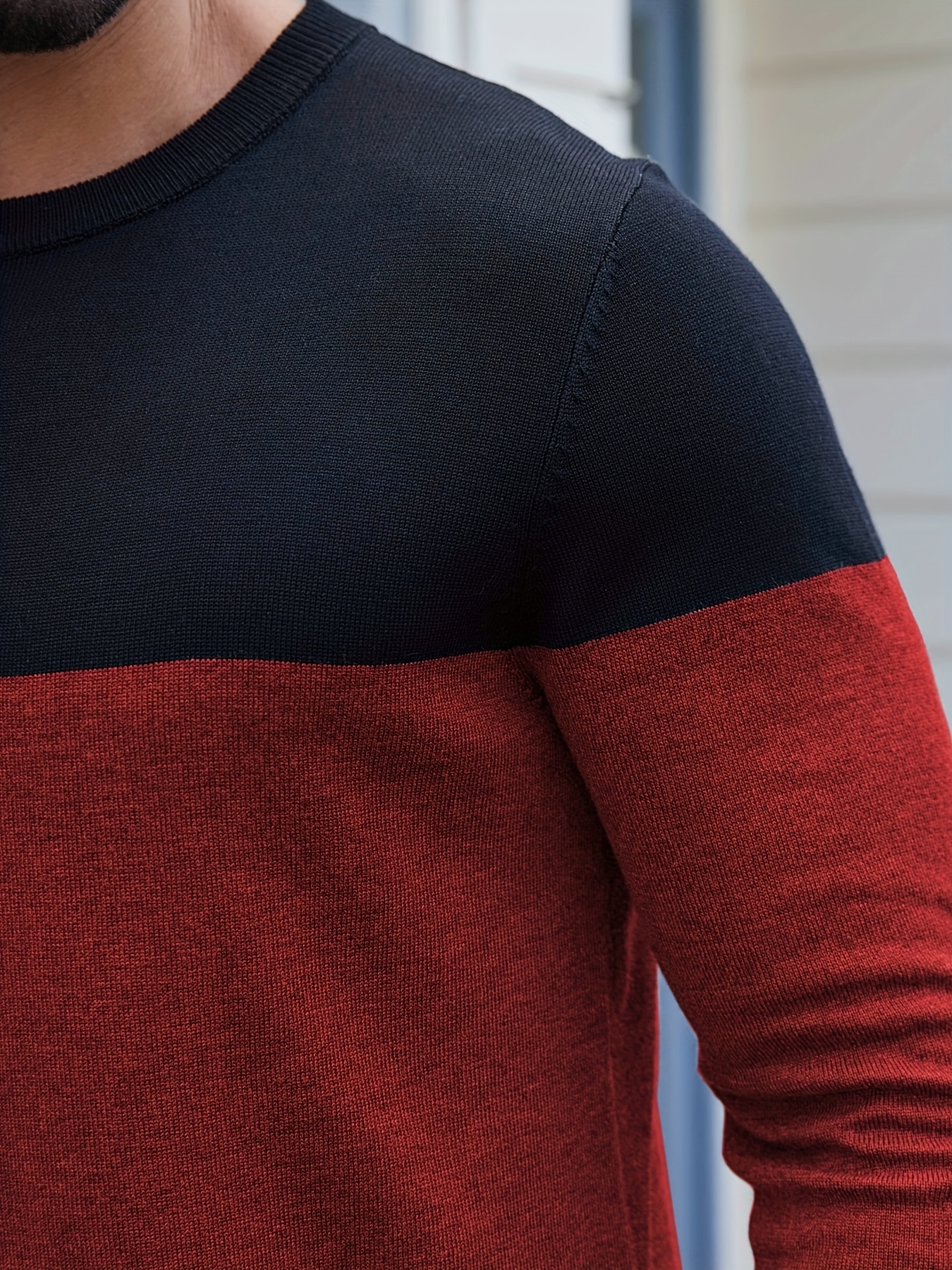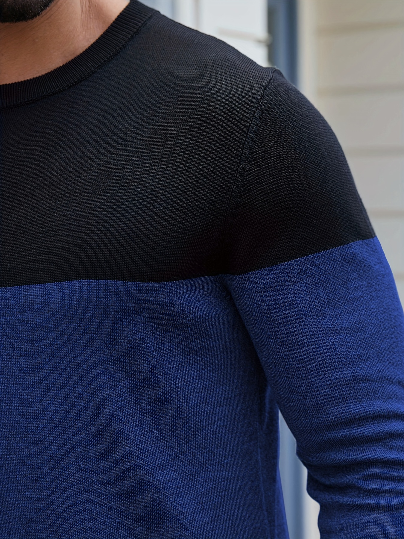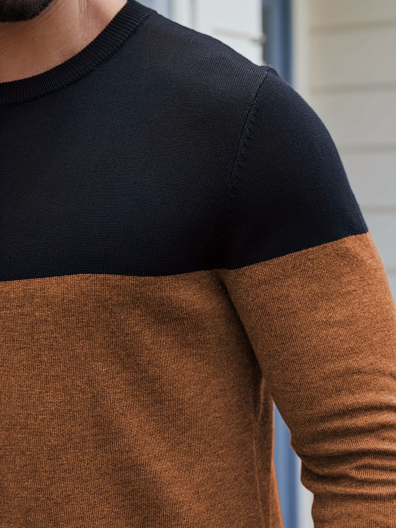Men'S Casual Long Sleeve Crew Neck Sweater - & Grey Color Block Design, Soft Stretchy Fabric, Regular Fit, Spring/Fall Essential for Casual Attire, Knit, Spring Fall Clothing, Classic Knitwear, Comfortable Knitwear