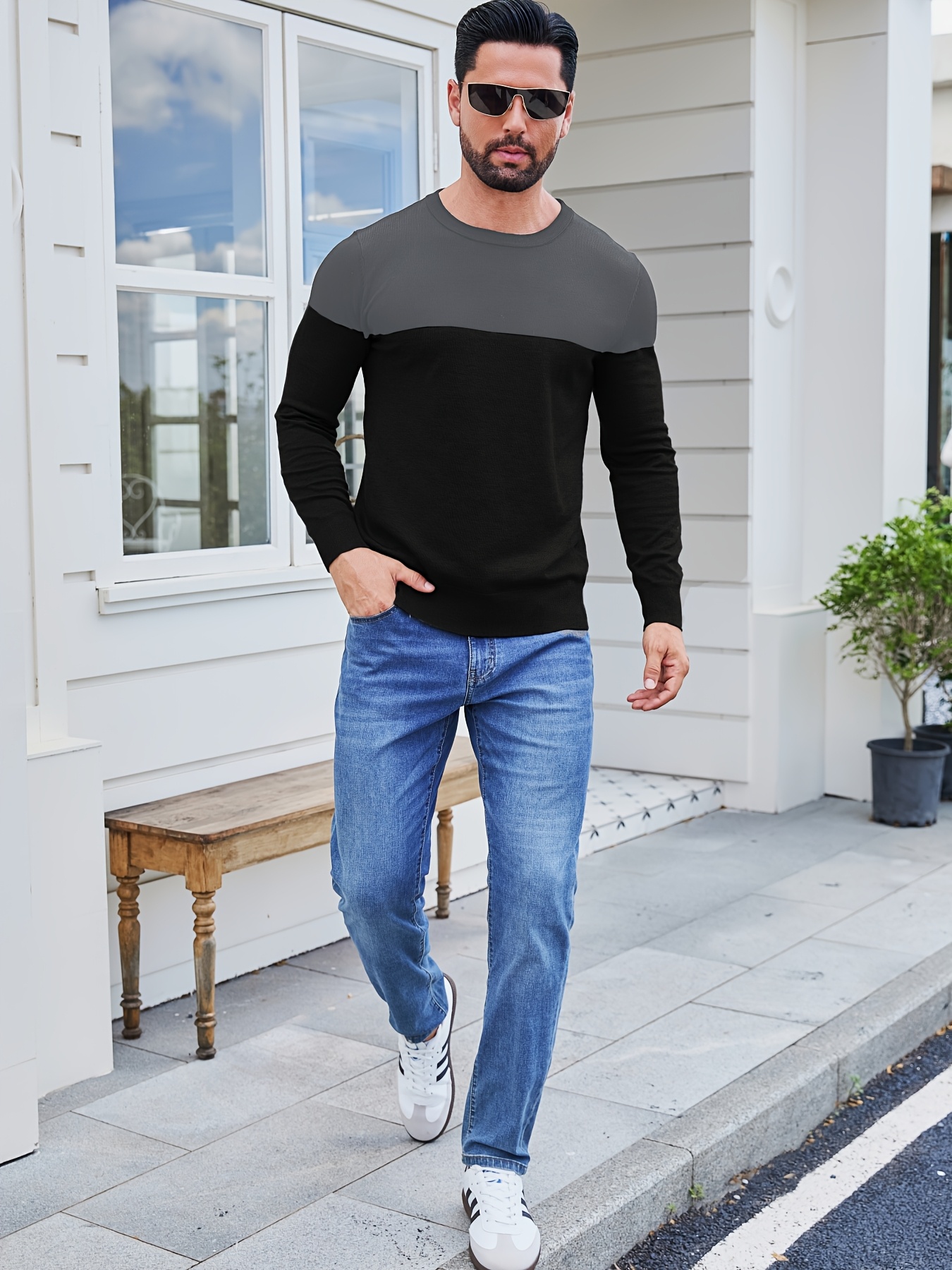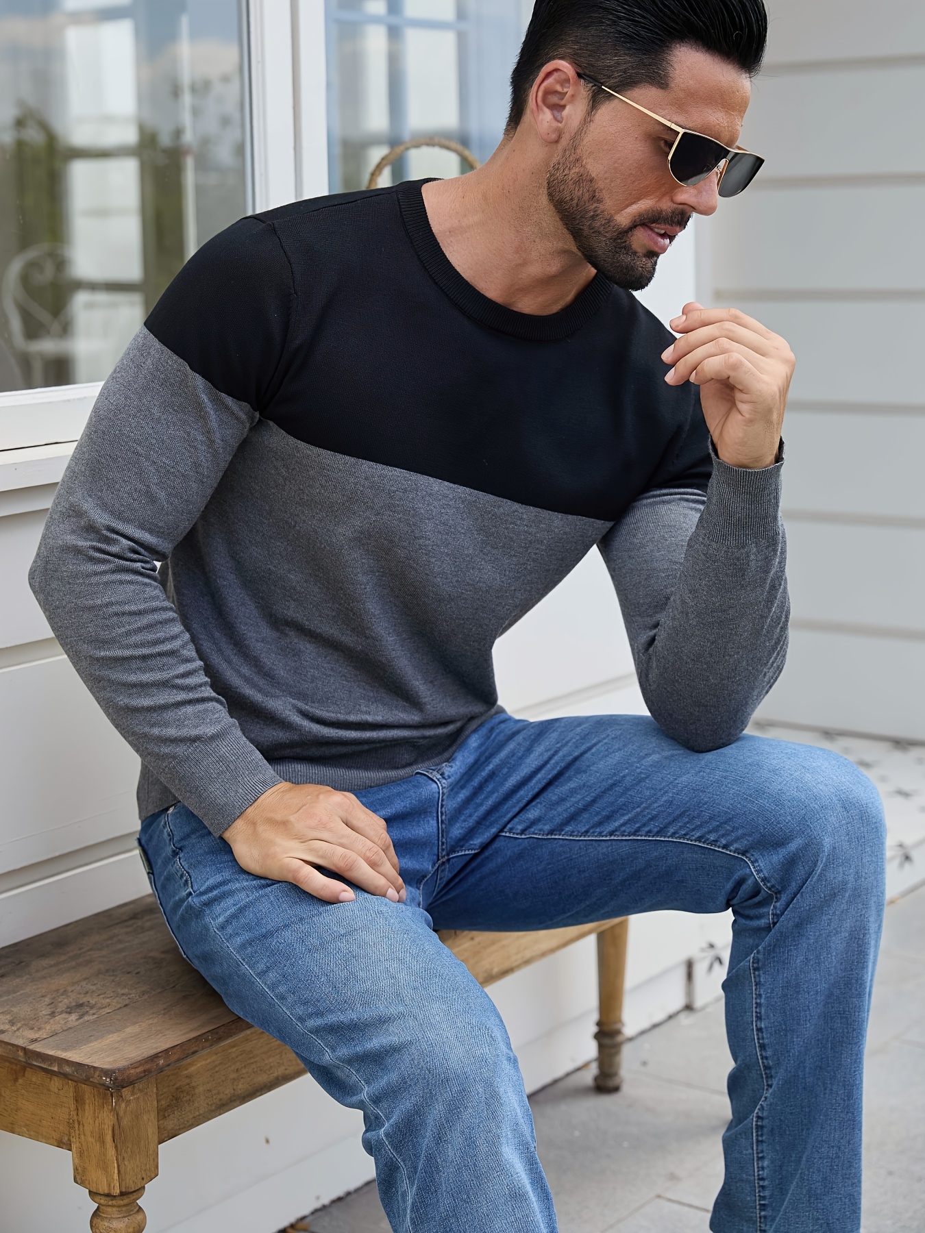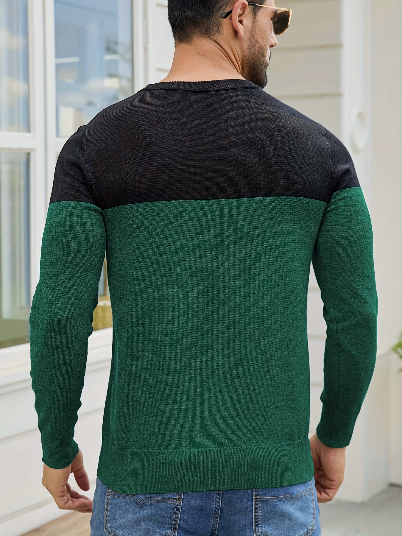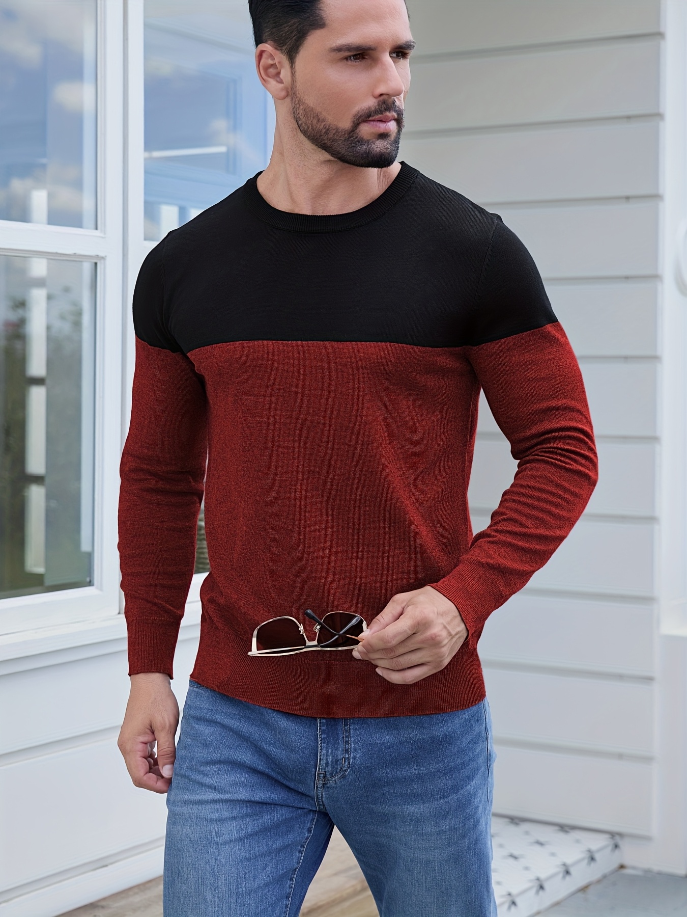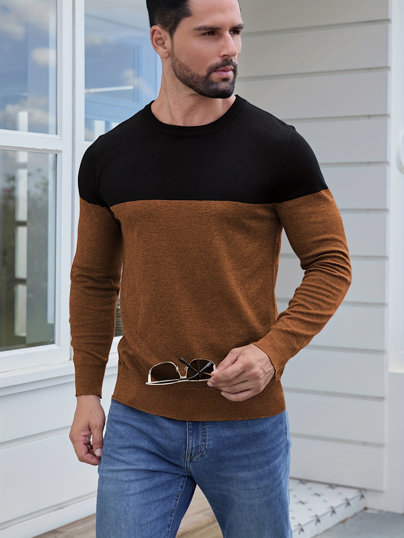 Men'S Casual Long Sleeve Crew Neck Sweater - & Grey Color Block Design, Soft Stretchy Fabric, Regular Fit, Spring/Fall Essential for Casual Attire, Knit, Spring Fall Clothing, Classic Knitwear, Comfortable Knitwear
