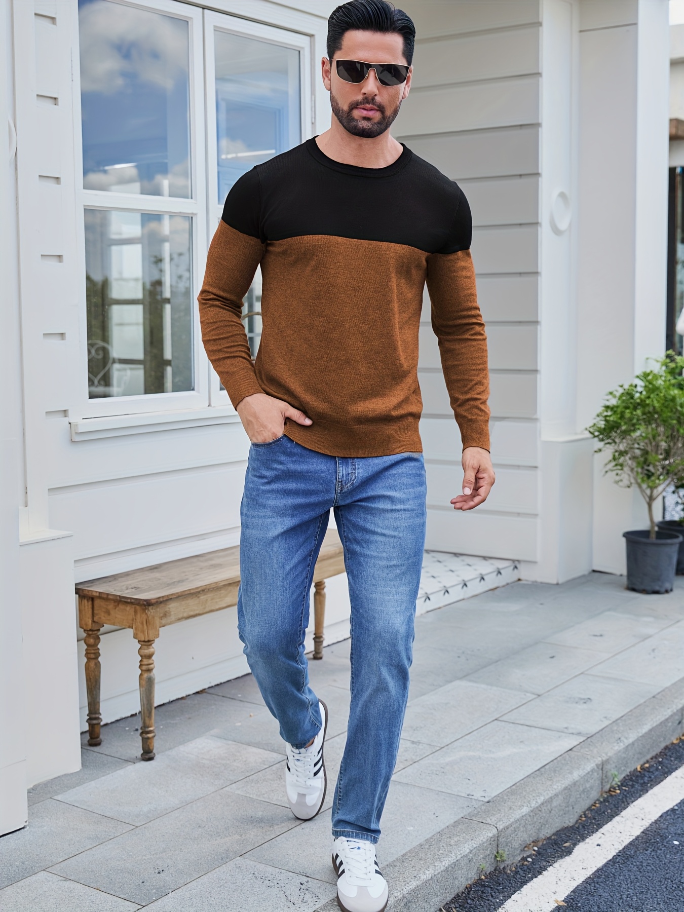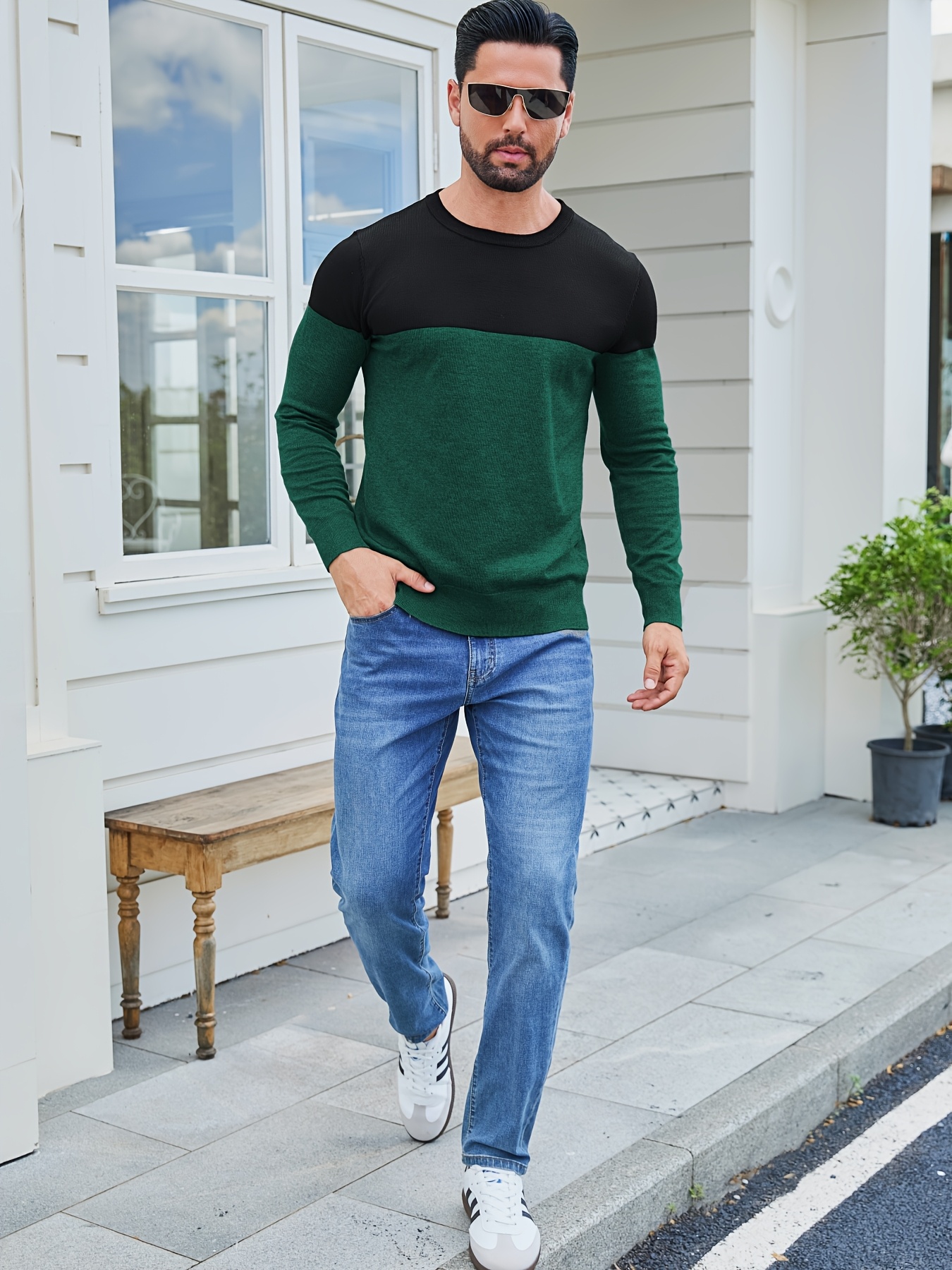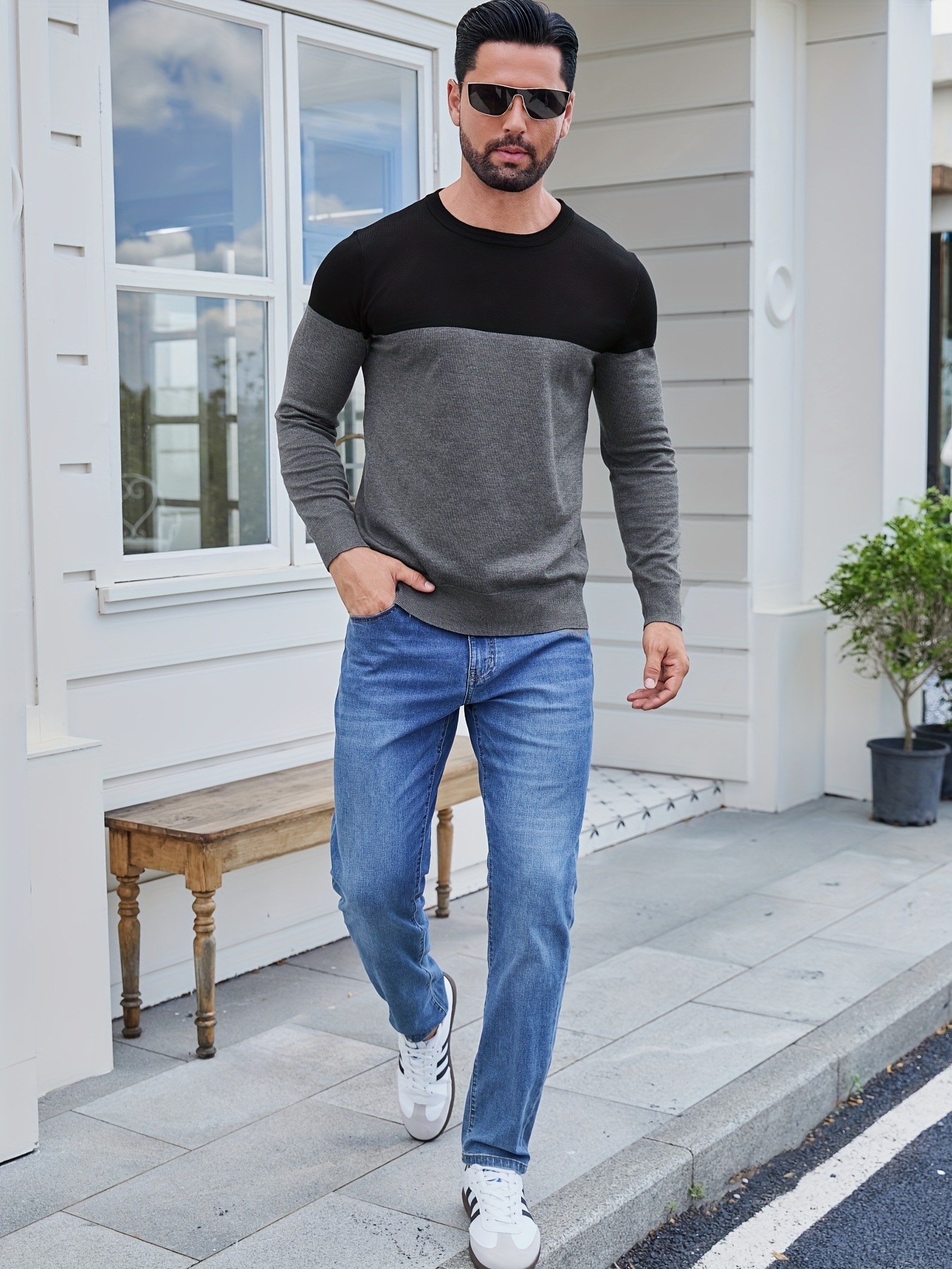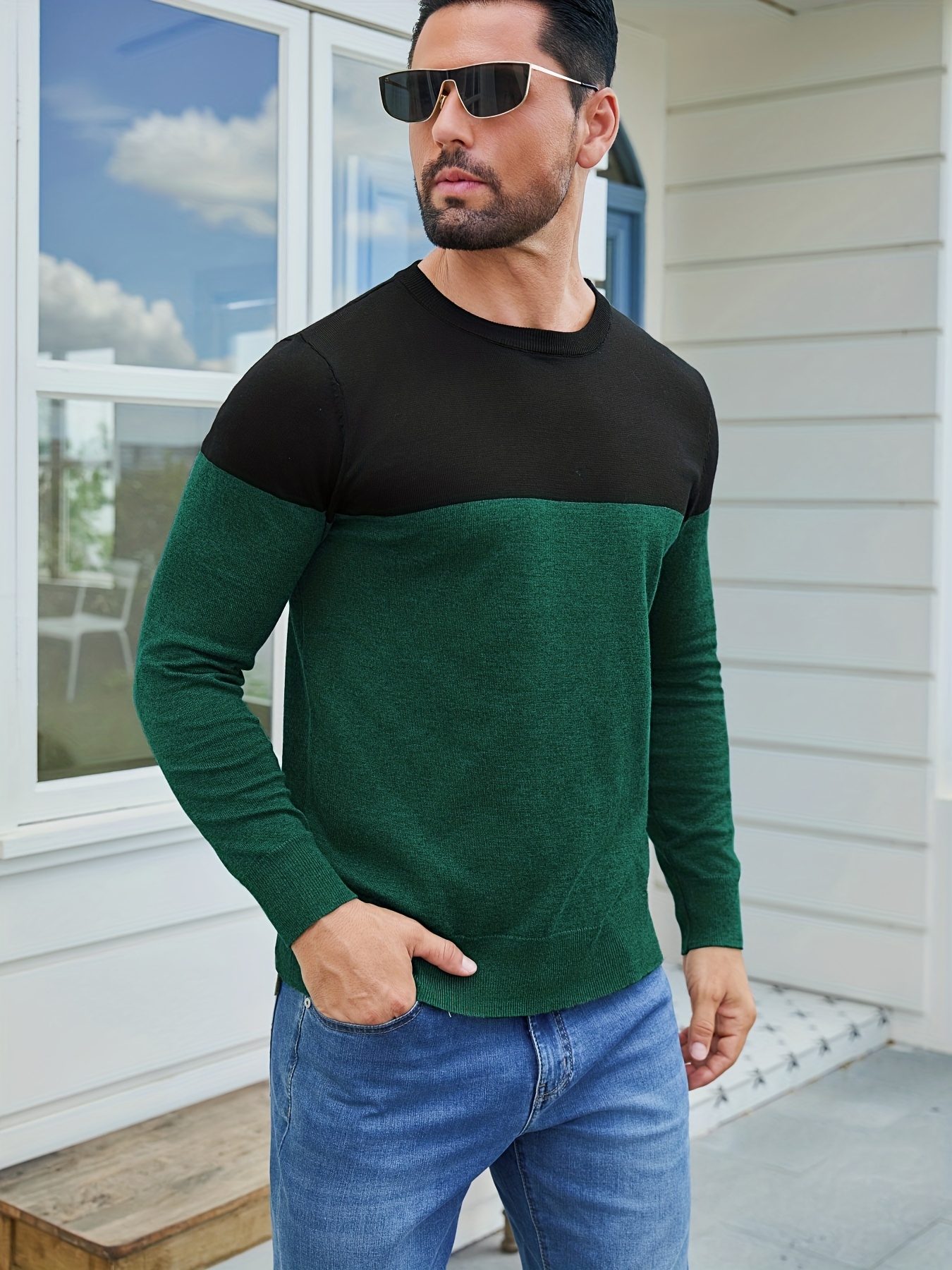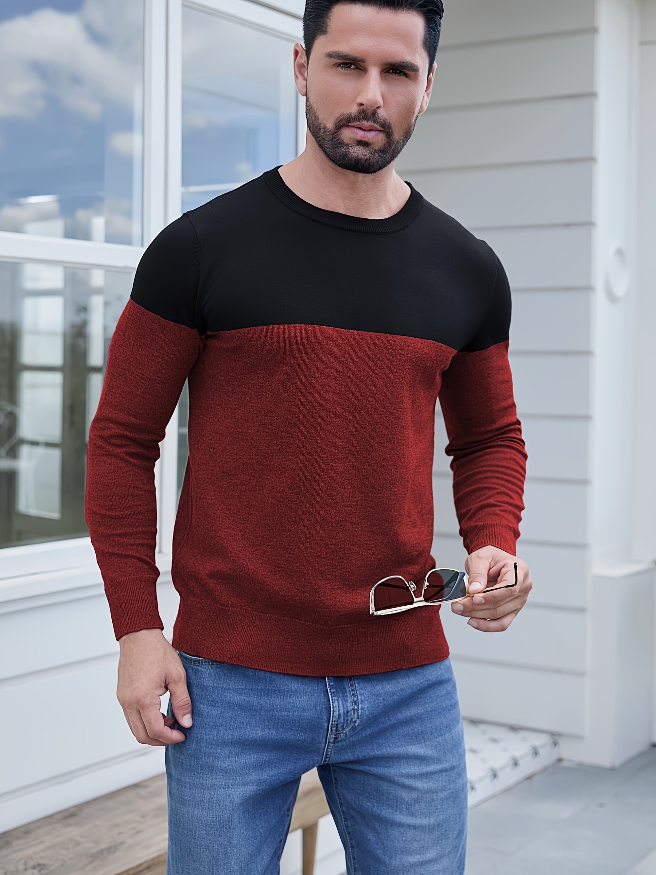 Men'S Casual Long Sleeve Crew Neck Sweater - & Grey Color Block Design, Soft Stretchy Fabric, Regular Fit, Spring/Fall Essential for Casual Attire, Knit, Spring Fall Clothing, Classic Knitwear, Comfortable Knitwear