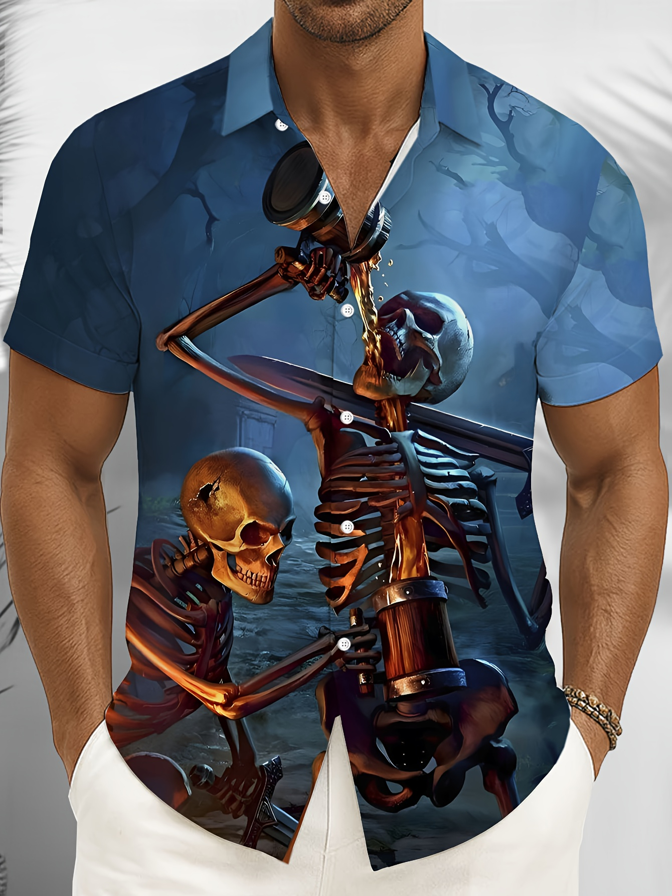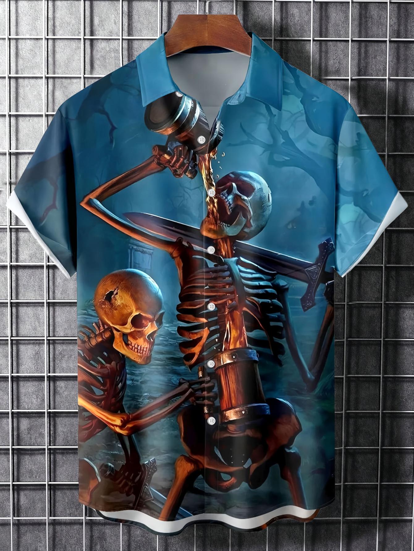 Men'S Halloween Gothic Shirt - Spooky Skeleton, Drinking Beer Party Costume - Button-Up Front - Lightweight Summer Formality - Perfect for Halloween Parties, Themed Events & Casual Attire - Funny Halloween Outfit for Men