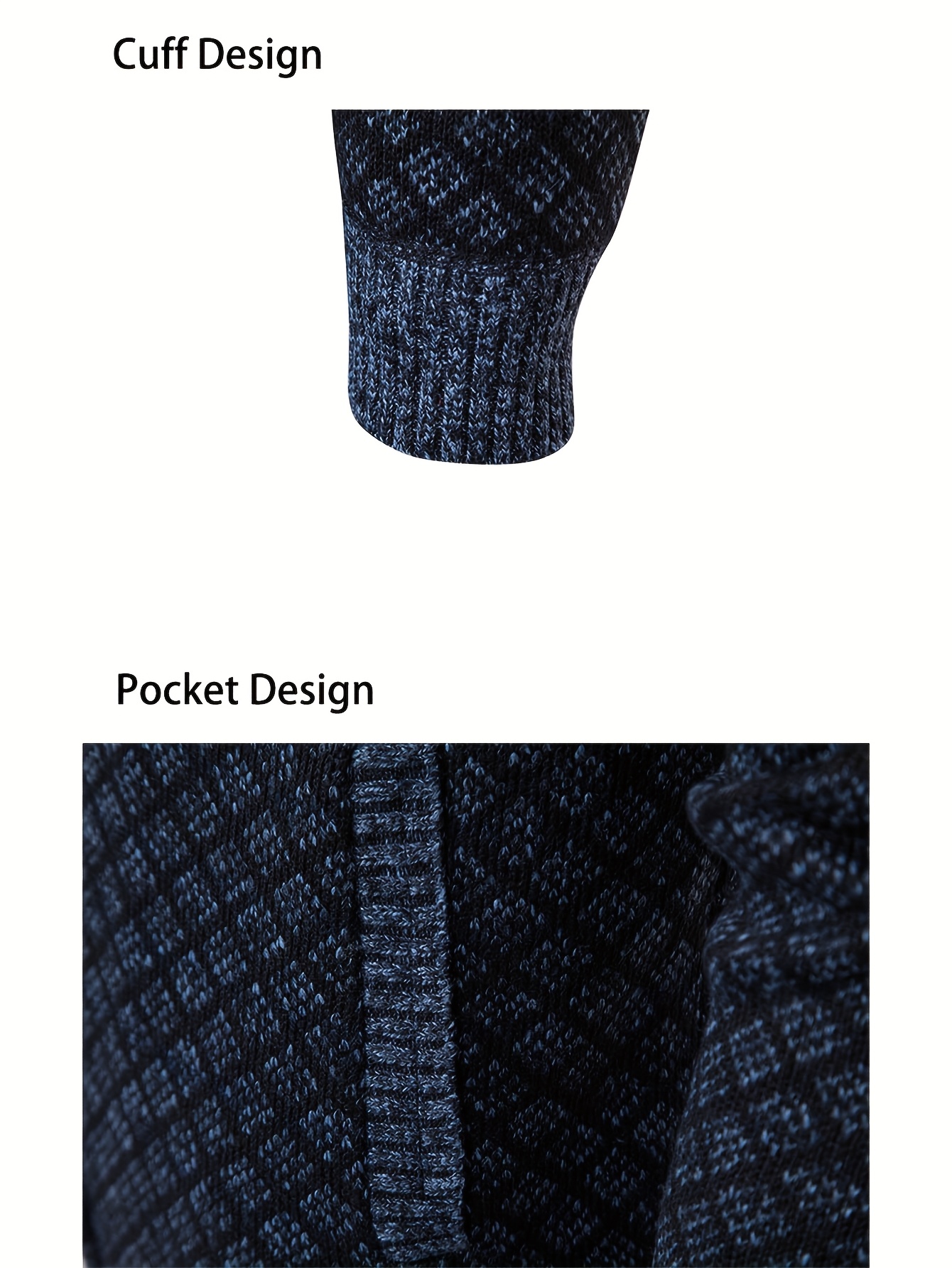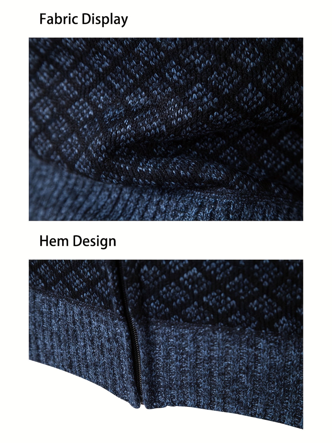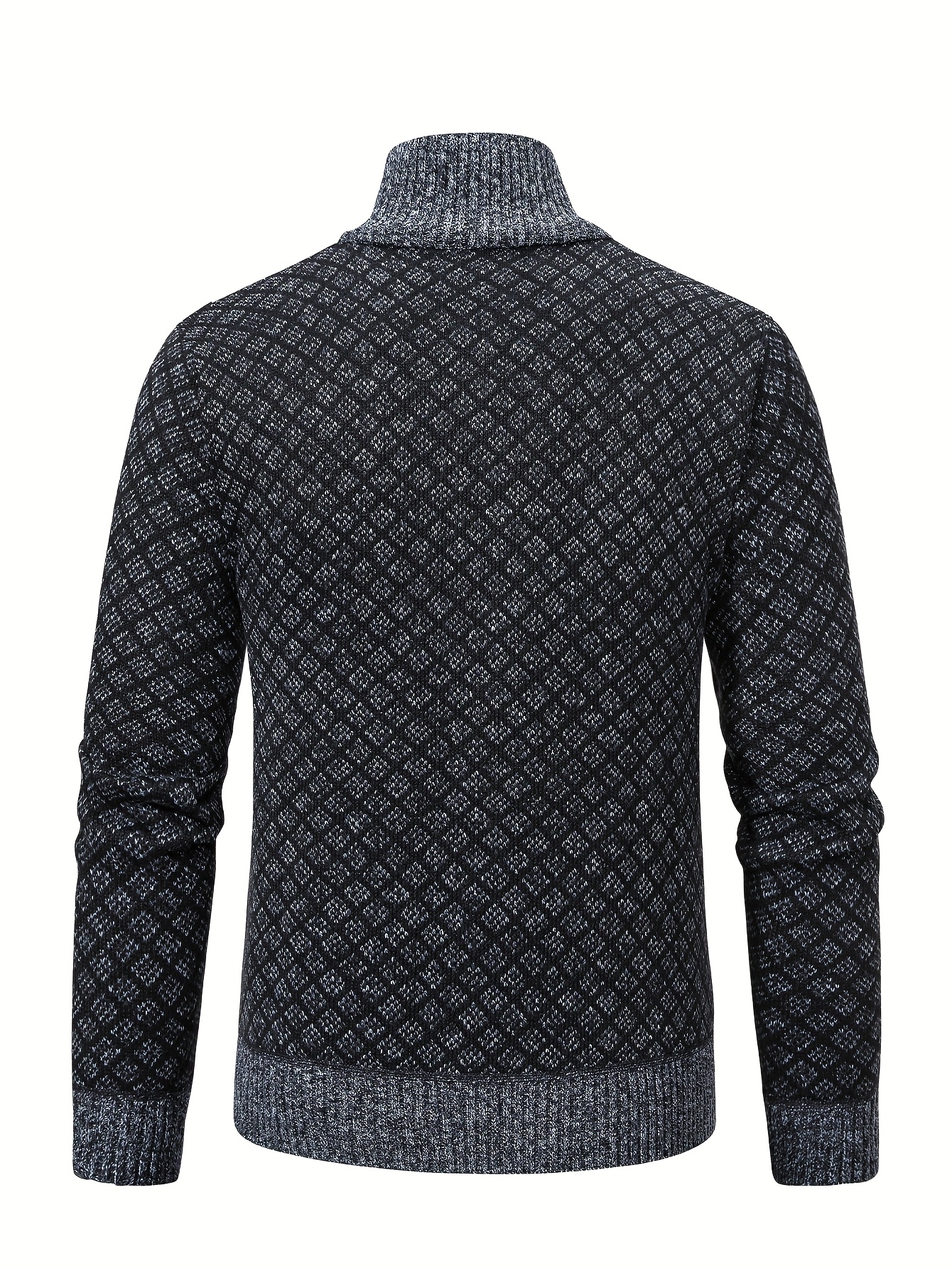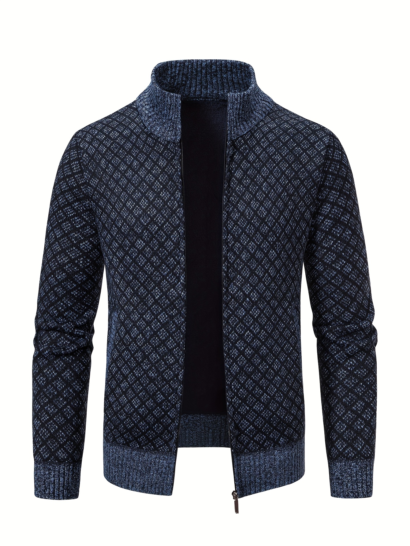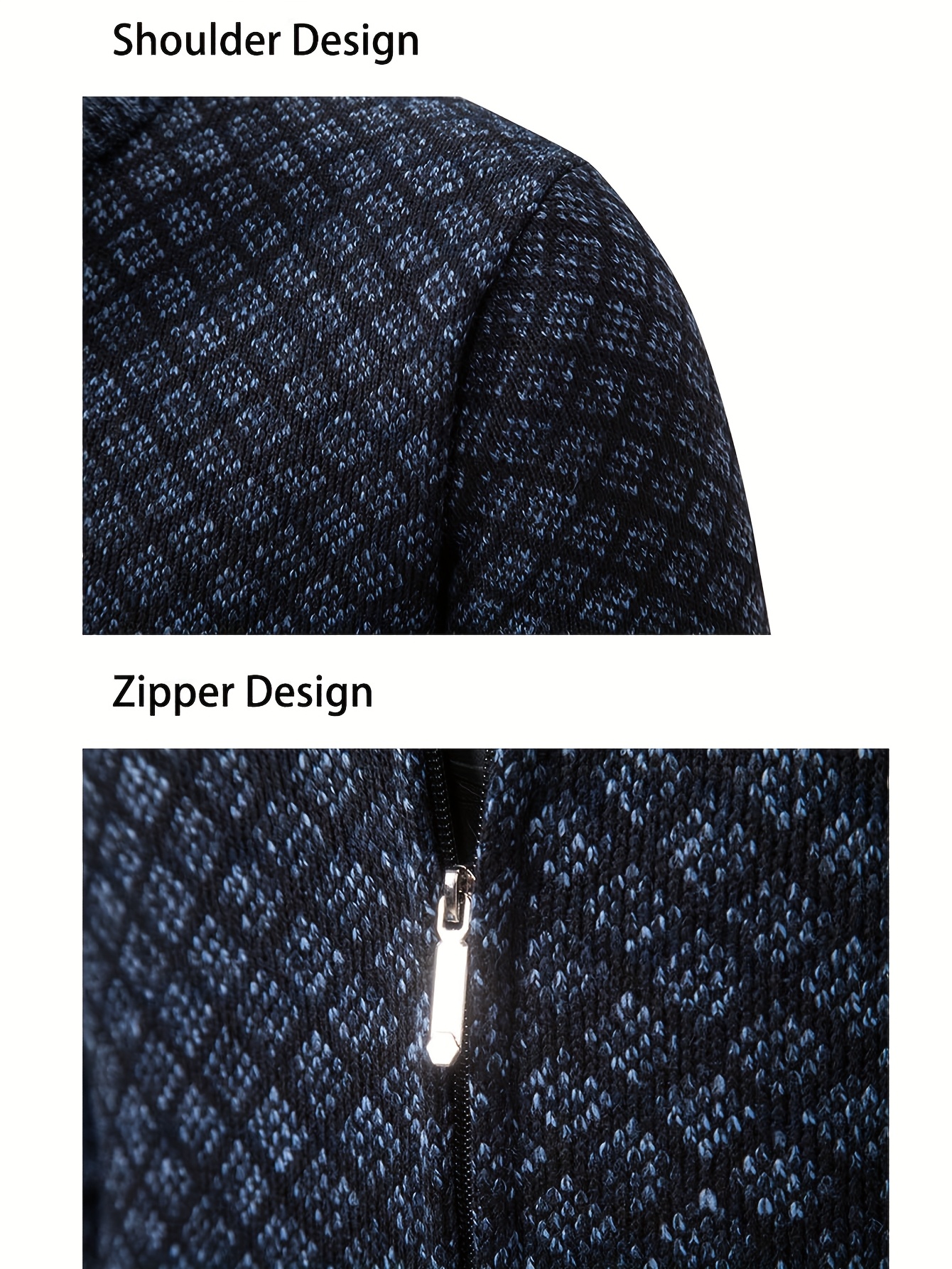 Men's Slim-Fit Thick Winter Knit Jacket with Stand Collar & Plaid Pattern - Warm Coat for Cold Weather, Casual Outerwear for Office or Everyday Use, Layering Piece under Suit Coats (Novelty Category)