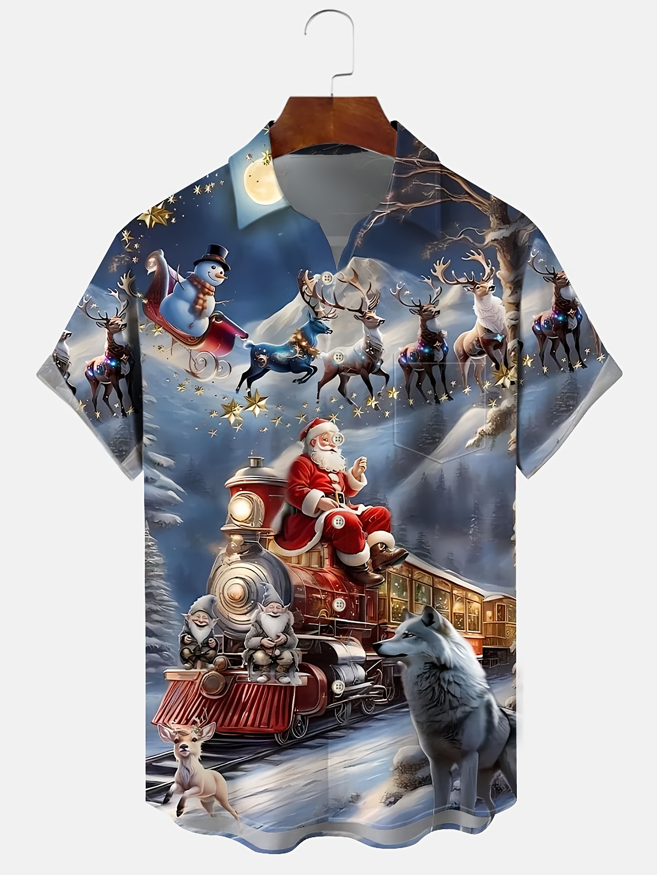 Men's Vintage Christmas Santa Claus Print Short Sleeve Dress Shirt with Collar & Pocket - Single-Button Closure, Machine Washable Holiday Party Attire, Pocket Square Compatible (Santa & Reindeer/Elf Patterns) - Summer Button
