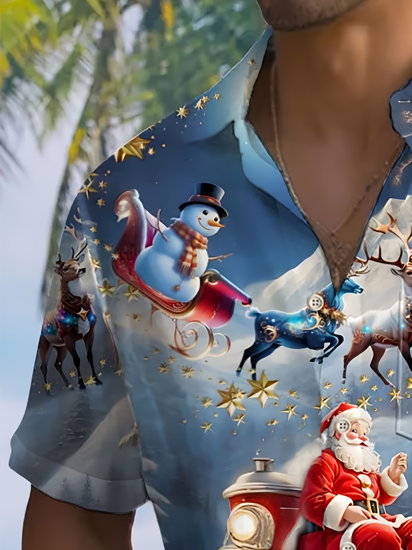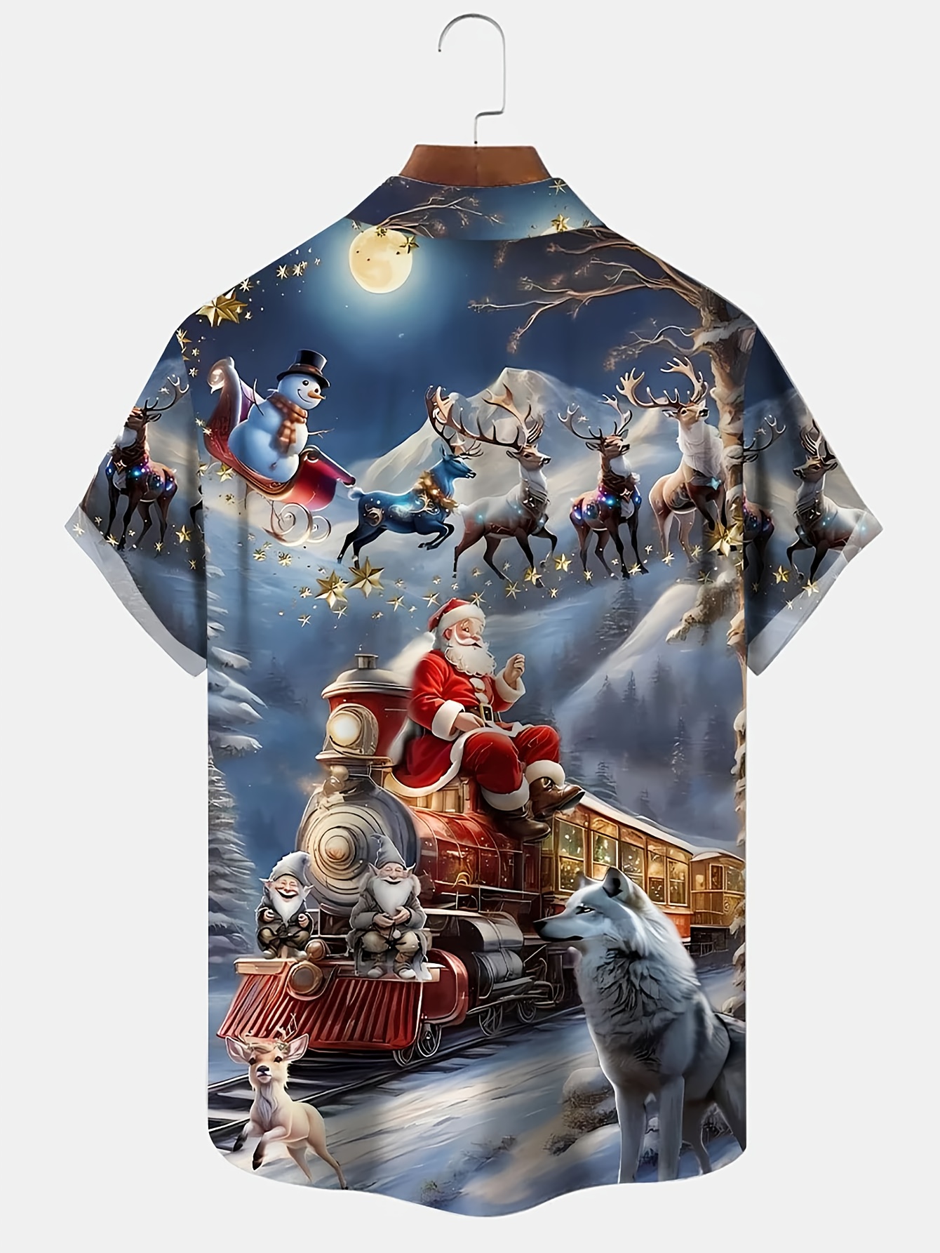 Men's Vintage Christmas Santa Claus Print Short Sleeve Dress Shirt with Collar & Pocket - Single-Button Closure, Machine Washable Holiday Party Attire, Pocket Square Compatible (Santa & Reindeer/Elf Patterns) - Summer Button