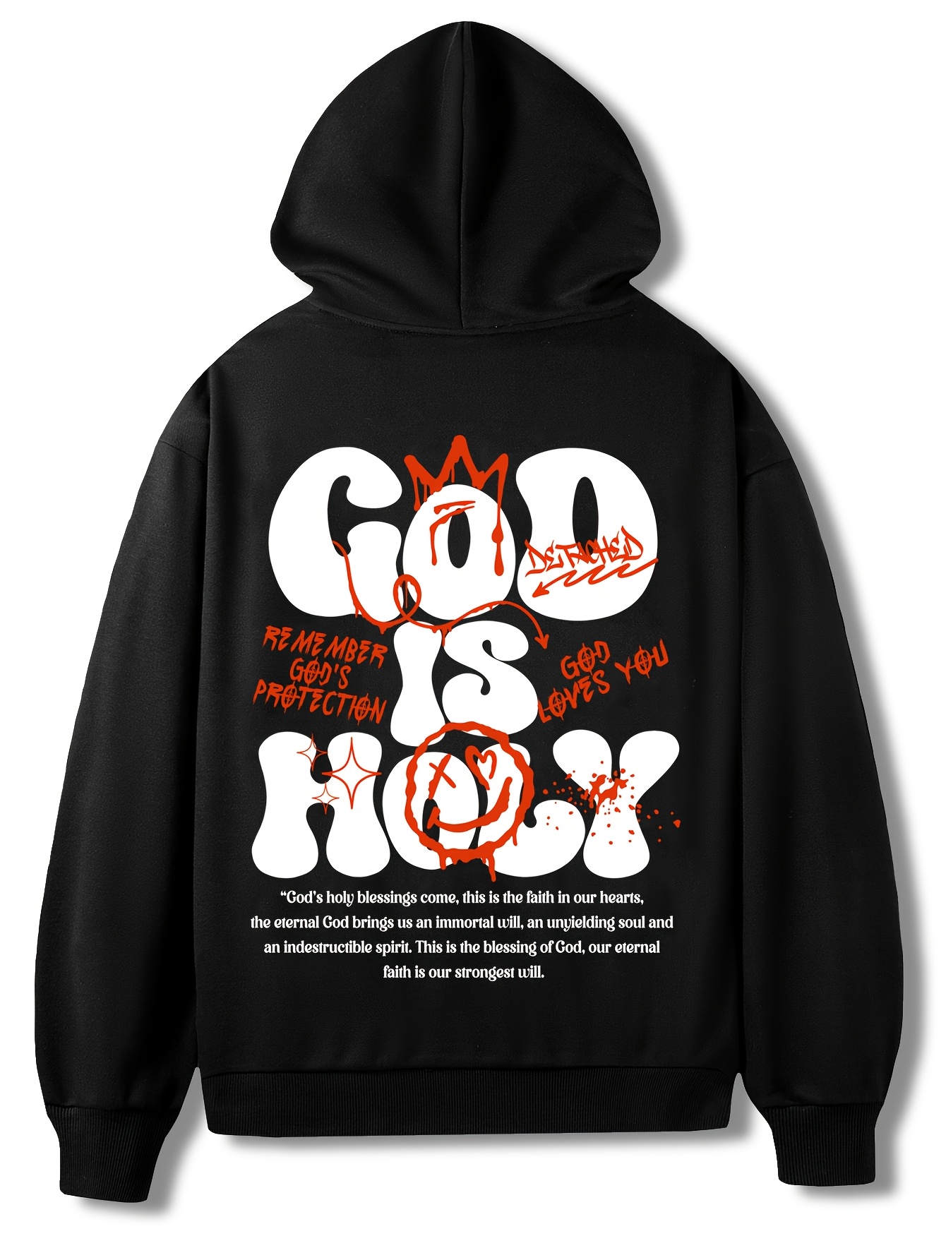[Graffiti Print Hoodie] Warm Casual Graffiti Print Hoodie - Men's 'GOD IS HOLY' Pullover with Drawstring & Kangaroo Pocket for Fall/Winter