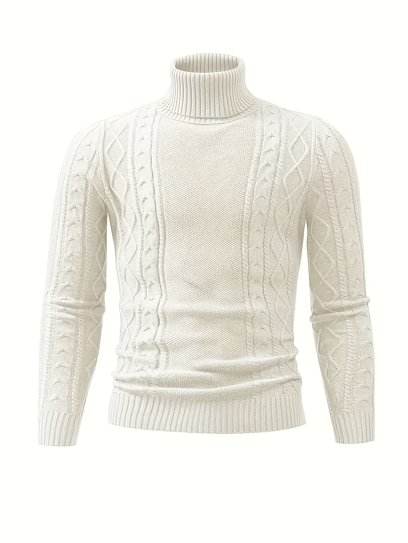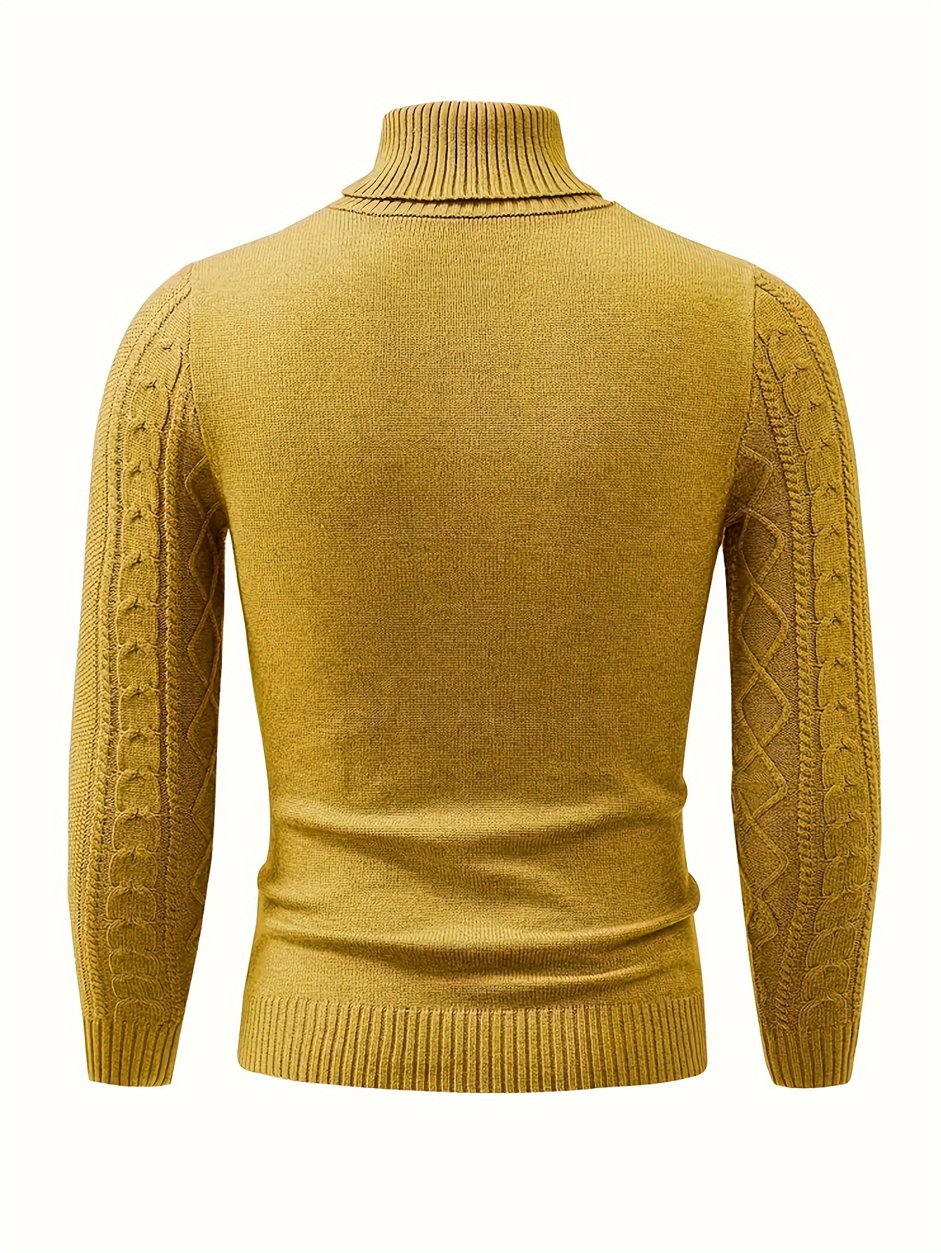 Men's Mustard Yellow High Neck Cable-Knit Sweater - Soft Stretchy Mid-Weight Pullover, Regular Fit Casual & Formal Wear, Hand Wash Only, Classic Comfort for Everyday, Pullover Style, Ribbed Cuffs